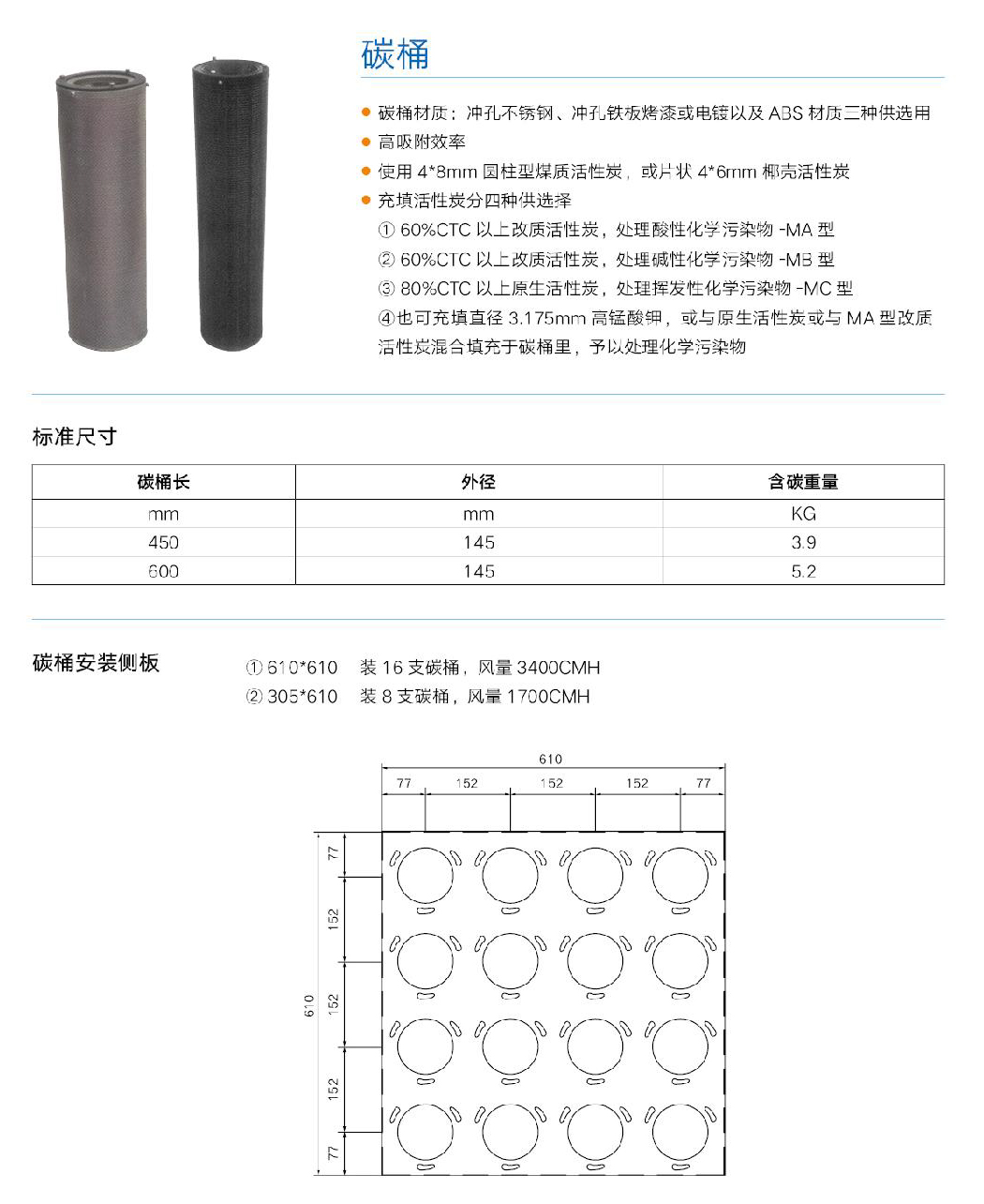 • 碳桶材质;冲孔不锈钢、冲孔铁板烤漆或电镀以及ABS材质二种供选用